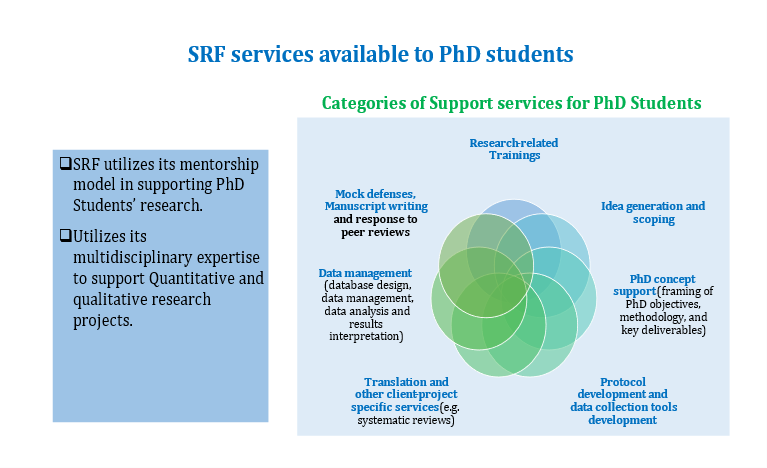 SRF recognizes that students at different levels of academic pursuit or different researchers may have unique research needs and may benefit from multidisciplinary support and review of their research by an experienced researcher to make it even more impactful. We offer research support services to students at different levels through a mentored-support approach. The support we offer is individual-centered, with acknowledgement of the differing skill sets among students and researchers. Our focus is always to use the current student project as an opportunity to build their research knowledge, skills and perhaps motivate them towards pursuing research careers. The consultations are organized as one-on- one sessions with a suitable consultant at SRF. ...These could be physical or virtual meetings, with proceedings captured for tracking progress. These are always interactive meetings with intermittent information sharing sessions about cross-cutting concepts that are relevant in contextualizing the student’s or researcher’s project. These concepts may be in: research methodology, epidemiology, biostatistics, results interpretation, analysis software, research presentation and communication, literature search, protocol development, and some topic-specific knowledge, etc. We do not develop proposals for students since this would contradict our core focus of capacity building of students in research. From the start, our clients have appreciated this model of research support since it builds their knowledge about their research and confidence in dissemination of their work both at their host institutions and on a public arena especially in research conferences. Below we specify the services we offer to different students or researchers at different levels.